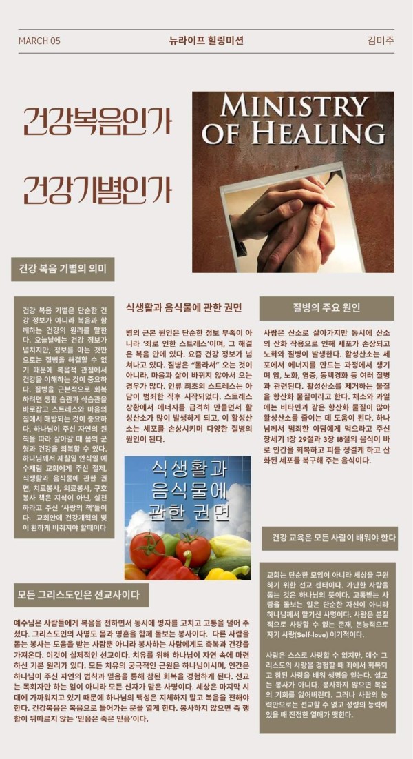 소그룹 건강복음인가, 건강기별인가 페이지 정보 작성자 주디김쪽지보내기 메일보내기 자기소개 아이디로 검색 전체게시물쪽지보내기 메일보내기 자기소개 아이디로 검색 전체게시물 작성일2026.03.05 07:00 조회수 987 글씨크기 + - 본문 오늘날에는 건강정보가 넘치지만, 정보를 아는 것만으로는 질병을 해결할 수 없기 때문에 복음적 관점에서 건강을 이해하는것이 중요합니다. 추천 0 페이스북 공유 트위터 공유 이전글SOSA 영성수련회에 여러분을 초청합니다. 26.03.26 다음글소그룹 교육 생활속 아로라 테라피(힐링아카데미) 26.03.01 댓글 0 댓글목록 등록된 댓글이 없습니다. 목록