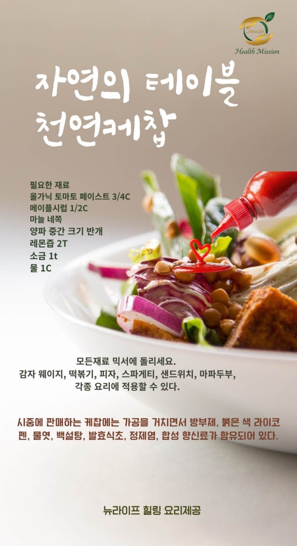 천연케찹 페이지 정보 작성자 주디김쪽지보내기 메일보내기 자기소개 아이디로 검색 전체게시물쪽지보내기 메일보내기 자기소개 아이디로 검색 전체게시물 작성일2026.03.01 11:43 조회수 1,862 글씨크기 + - 본문 천연케찹은 쉽고, 건강하며, 다양한 요리에 활용할 수 있다. [이 게시물은 최고관리자님에 의해 2026-04-05 14:41:37 소식에서 이동 됨] 추천 0 페이스북 공유 트위터 공유 이전글비건 치즈 vege parmesan cheese 26.03.03 다음글'마리아타 교회 건강 동우회' 26.02.26 댓글 0 댓글목록 등록된 댓글이 없습니다. 목록