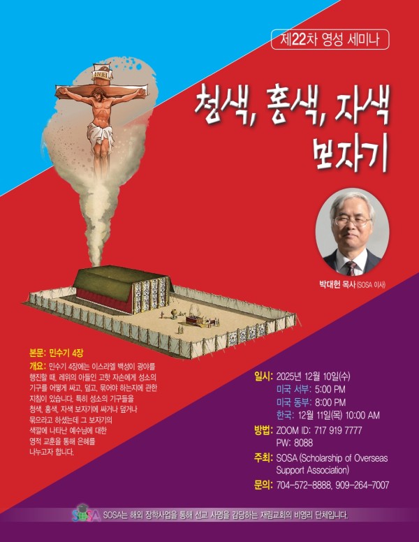 이번에는 SOSA 부운영위원장이시며 한국에서 40년간 성공적 목회를 마치고 은퇴후에도 다시 서중한합회 수색향기로 교회에서 정열적 목회로 수많은 영혼을 침례로 이끌고 있는 박대헌 목사님을 강사로 모시게 되었습니다. 한해을 마감하는 이 소중한 시기에 영성이 풍성한 말씀의 성회로 여러분들을 정중히 초청합니다.