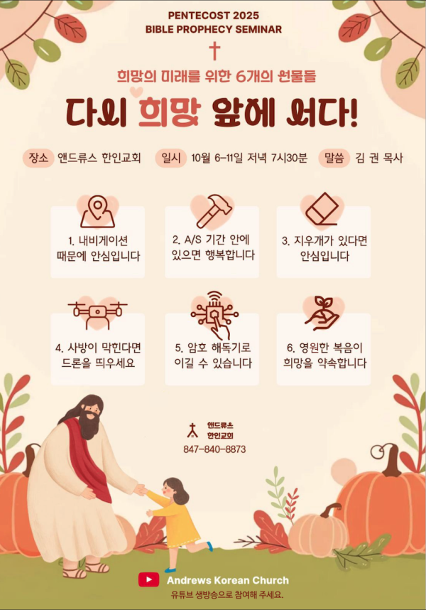* 온라인방송: 모든 강의는 "앤드류스한인교회" 유튜브 채널을 통해 생방송으로 참여하실 수 있습니다.