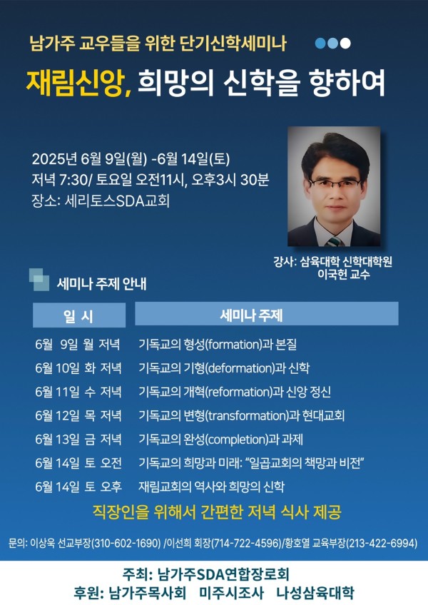 지역교회 "재림신앙, 희망의 신학을 향하여" 페이지 정보 작성자 KCAMD쪽지보내기 메일보내기 자기소개 아이디로 검색 전체게시물쪽지보내기 메일보내기 자기소개 아이디로 검색 전체게시물 작성일2025.05.12 21:14 조회수 8,720 글씨크기 + - 본문 남가주 교우들을 위한 단기 신학세미나일시 : 2025년 6월 9일 -14저녁 7:30/토요일 오전 11시, 오후 3시 30분장소 : 세리토스 SDA 교회 추천 0 페이스북 공유 트위터 공유 이전글마라나타 찬양 선교단 미주공연 25.05.14 다음글2025 중남부 연합 야영회 안내 25.04.16 댓글 0 댓글목록 등록된 댓글이 없습니다. 목록