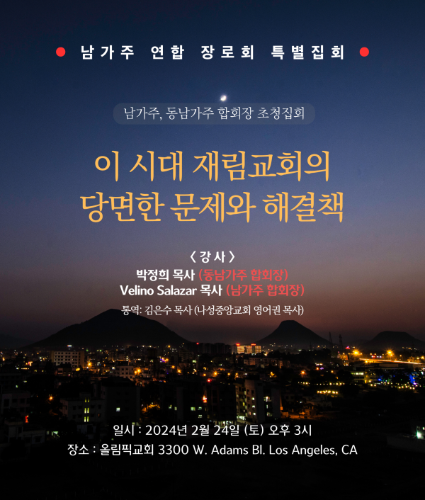 기타 동남가주, 남가주 합회장 초청특별 집회 <남가주 연합 장로회 > 페이지 정보 작성자 최고관리자쪽지보내기 메일보내기 자기소개 아이디로 검색 전체게시물쪽지보내기 메일보내기 자기소개 아이디로 검색 전체게시물 작성일2024.02.12 22:07 조회수 13,306 글씨크기 + - 본문 <이 시대 재림교회의 당면한 문제와 해결책> 추천 0 페이스북 공유 트위터 공유 이전글2024 인터네셔널 카얌 네팔 단기 선교사 모집 24.03.01 다음글Napa(캘리포니아)에서 진행될 백투에덴 디톡스 힐링 캠프에 초청드립니다! 24.02.08 댓글 0 댓글목록 등록된 댓글이 없습니다. 목록