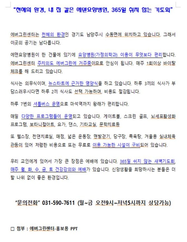 “천혜의 환경, 내 집 같은 에덴요양병원, 365일 쉬지 않는 기도회”